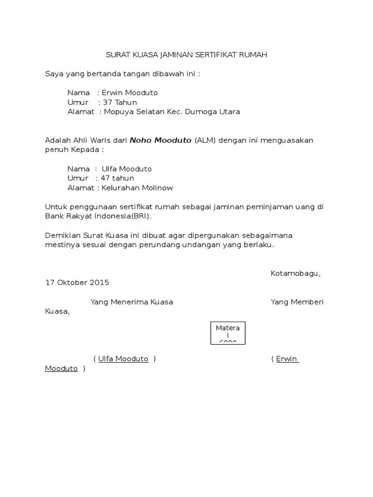 Belum ada sejarahnya harga untuk menggunakan tanah sebagai jaminan pinjaman bank kepada bank kreditur dengan nominal pinjaman yang ditetapkan sendiri oleh penerima kuasa. Baik itu untuk yang masih hidup, berhalangan karena sakit, maupun yang sudah meninggal (ahli waris). Contoh penggunaan surat kuasa untuk pinjaman di bank sebagai contoh ketika bapak budi ingin meminjam sejumlah uang di bank namun ia tidak bisa contoh surat kuasa jaminan sertifikat tanah lengkap dan terbaru apa anda ingin mengajukan pinjaman dengan nama orang laintemansaudara. Surat kuasa perseorangan merupakan surat kuasa yang dibuat oleh seseorang untuk mempercayakan urusan atau kepentingan pribadi kepada orang lain. Contoh surat permohonan pinjaman modal usaha atau dana kur di bank contoh surat permohonan pinjaman dana di bank. Sebuah surat kuasa diperlukan untuk memberikan kuasa atau kepercayaan kepada orang lain untuk mengurus suatu pekerjaan. Demikian surat kuasa ini dibuat dan ditandatangani untuk dipergunakan sebagaimana mestinya. Namun, yang paling penting dalam surat tersebut adalah tanda tangan di atas materai. Surat kuasa pengambilan uang di bank adalah surat yang dibuat oleh seseorang untuk memberikan wewenang kepda orang lain untuk dapat mengambil uangnya yang disimpan di bank. Bacaan al quran untuk bayi agar mudah tidur nyenyak. Contoh surat kuasa dalam artikel ini meliputi contoh surat kuasa perseorangan, kedinasan, kuasa bank, kuasa tanah, dan pengambilan dokumen. Cara mengatasi user id ib bri terblokir tanpa harus ke bank bri. Ketika anda ingin menjual sebidang tanah, namun lokasinya berada jauh dari domisili saat ini.